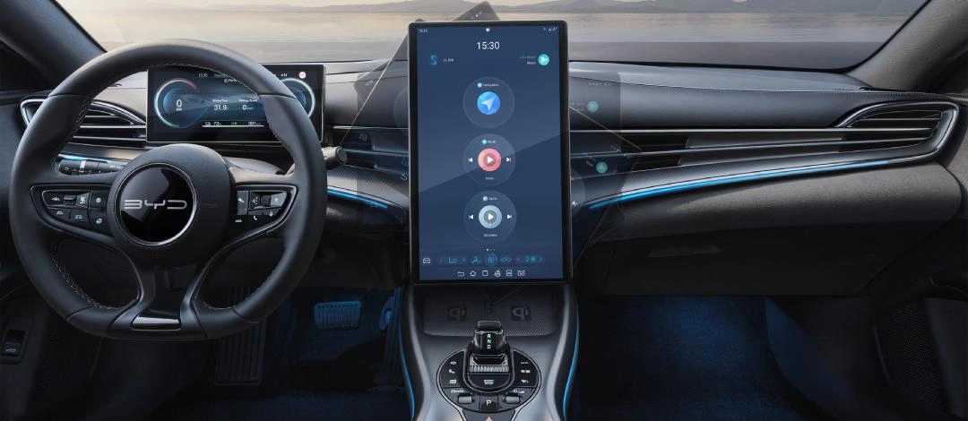 Khu vực trung tâm được trang bị màn hình cảm ứng với kích thước 15,6 inch, có thể xoay ngang hoặc dọc, giúp người lái tận hưởng trải nghiệm công nghệ đầy thú vị.